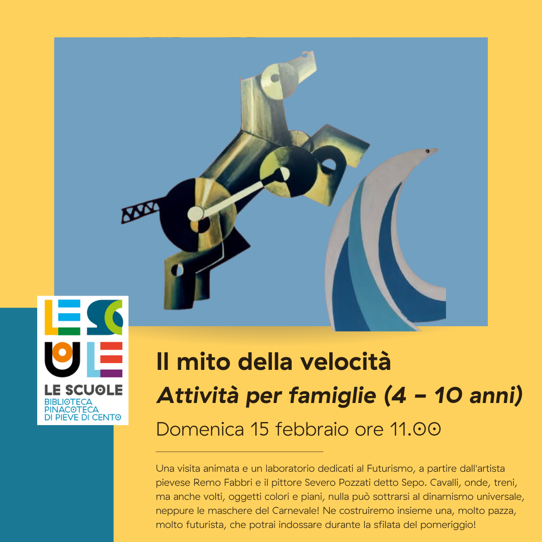 Una visita animata e un laboratorio dedicati al Futurismo, a partire dall'artista pievese Remo Fabbri e il pittore Severo Pozzati detto Sepo. Cavalli, onde, treni, ma anche volti, oggetti colori e piani, nulla può sottrarsi al dinamismo universale, neppure le maschere del Carnevale! Ne costruiremo insieme una, molto pazza, molto futurista, che potrai indossare durante la sfilata del pomeriggio!