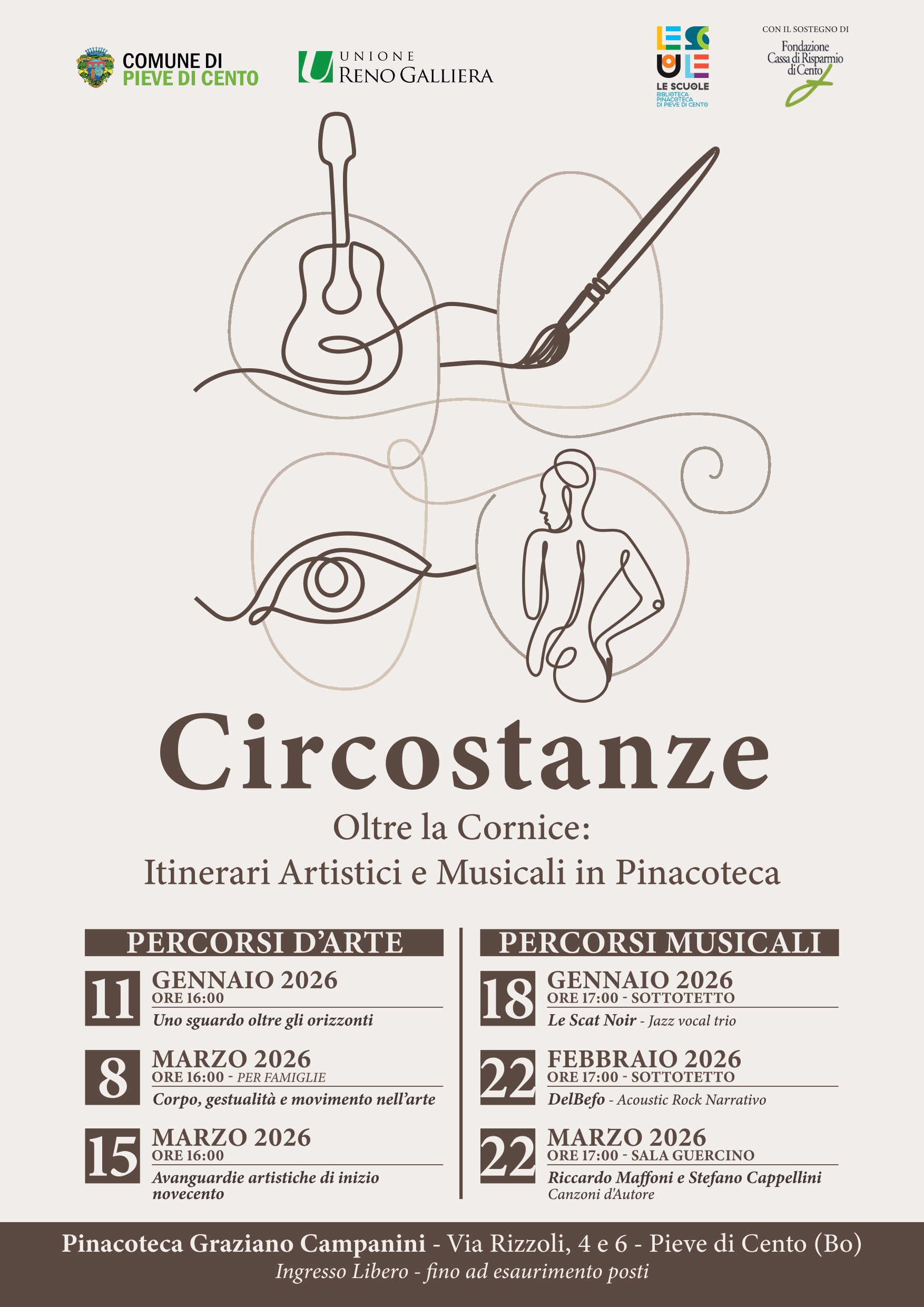 Circostanze è una rassegna culturale che intreccia arte e musica in percorsi distinti ma dialoganti, ospitati nella Pinacoteca Graziano Campanini di Pieve di Cento.